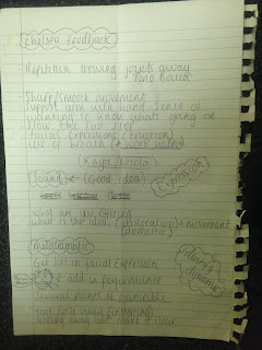 The one sheet above shows the feedback that Lewis wrote for me whilst I sat after performing my solo and received what my class mates thought about it, and what Katye and Nicole thought about it. The other sheet is just of what Katye noted down about my solo.